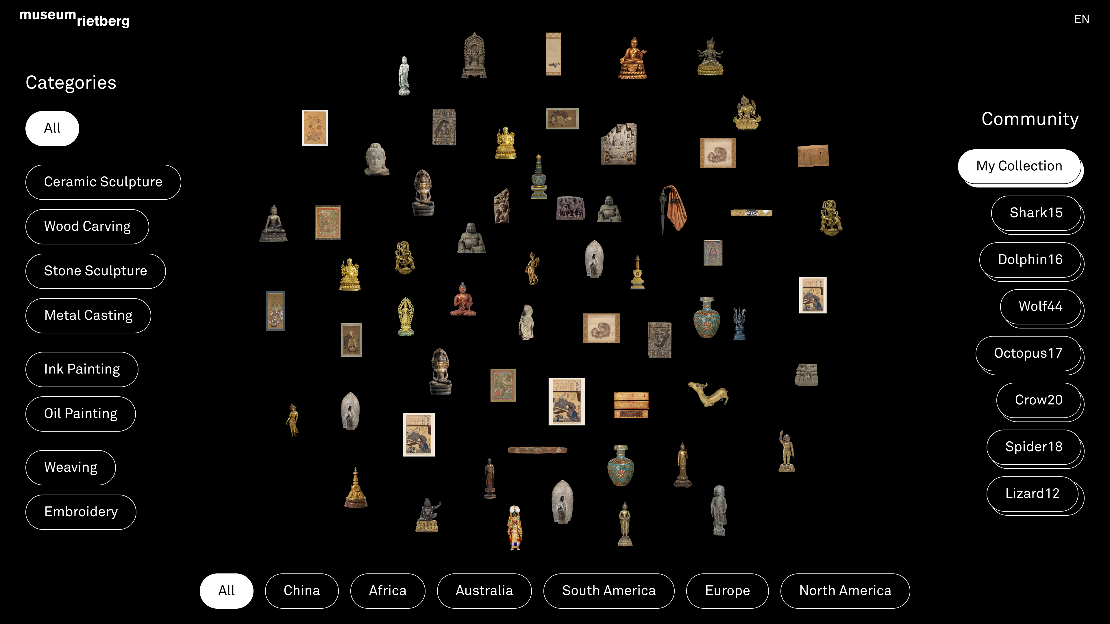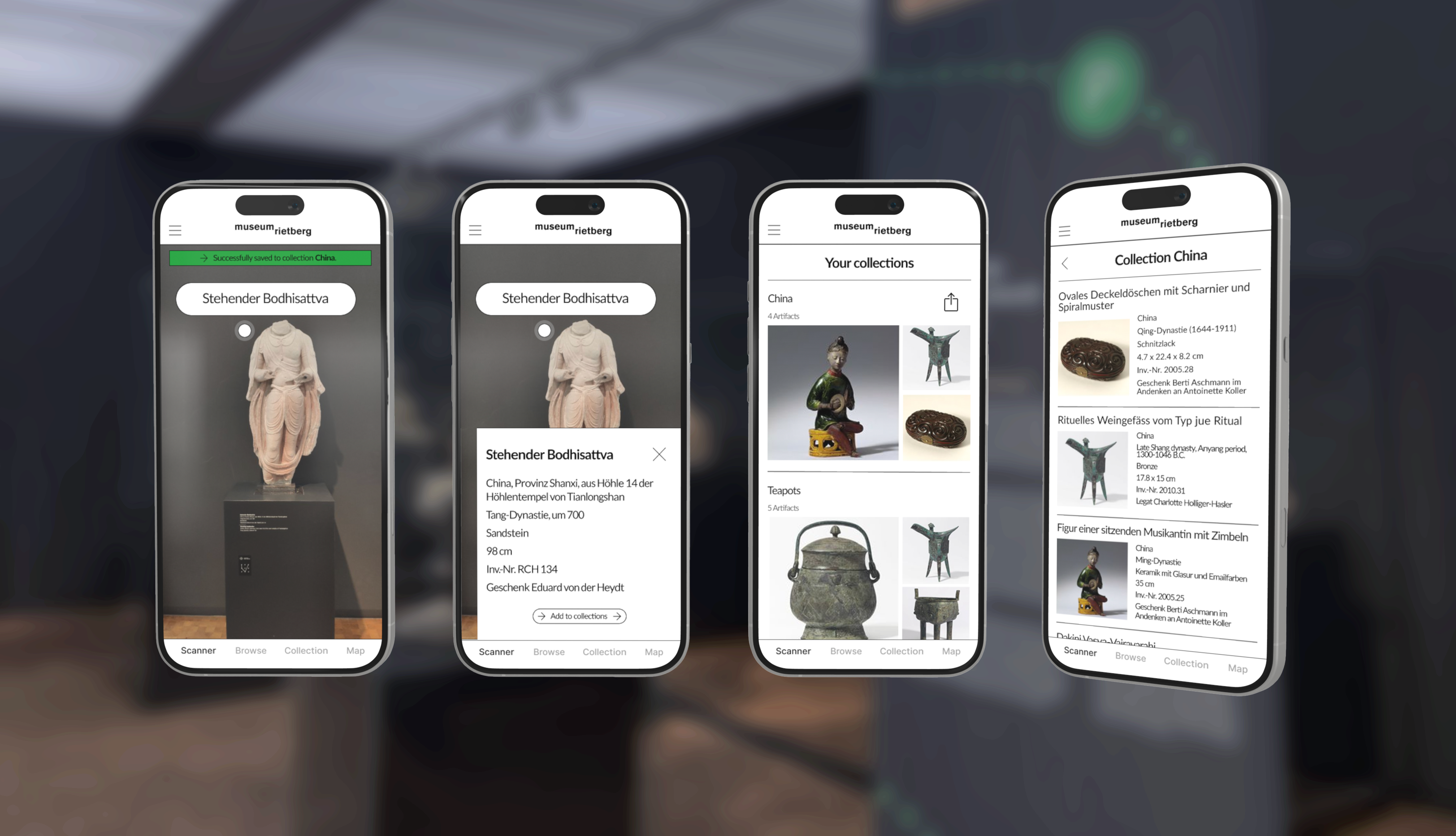 Im Museum Rietberg werden tausende von kulturellen Artefakten aus vielen verschiedenen Epochen und Kulturen gelagert und ausgestellt. Im aktuellen Museumskonzept kommen die geschichtlichen, kulturellen Hintergründe oftmals zu kurz, es fehlt der physische Platz für zusätzliche Informationen. Mit unserem Konzept kann sowohl dem kunsthistorischen als auch der anderen Bedeutungen und Kontexten gerecht werden, auch koloniale Vergangenheiten können dargelegt werden, ohne dass das szenographische Konzept darunter leidet. Die Besucher*innen erhalten einen Token, mit welchem sie Artefakte, die sie interessieren, speichern können. Die so entstandene persönliche Sammlung kann an einem Kiosk-Screen im Museum betrachtet, nach verschiedenen Eigenschaften kategorisiert und nach weiteren Informationen durchstöbert werden. Um auch zu Hause weiter Zugriff auf die Sammlung zu haben, kann ein QR-Code ausgedruckt werden. So wird der Museumsbesuch nachhaltig und ermutigt zu einem erneuten Besuch des Museums.
