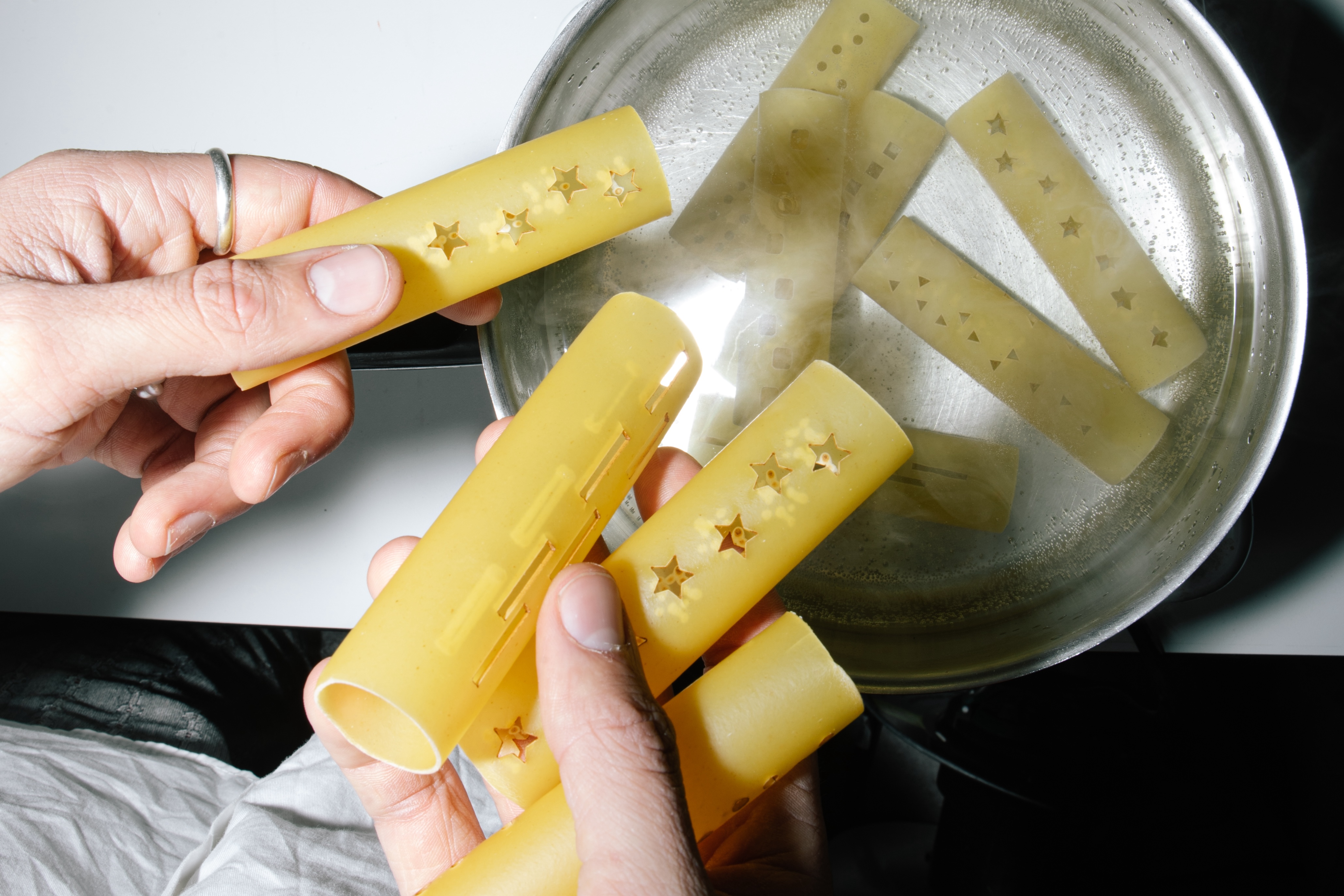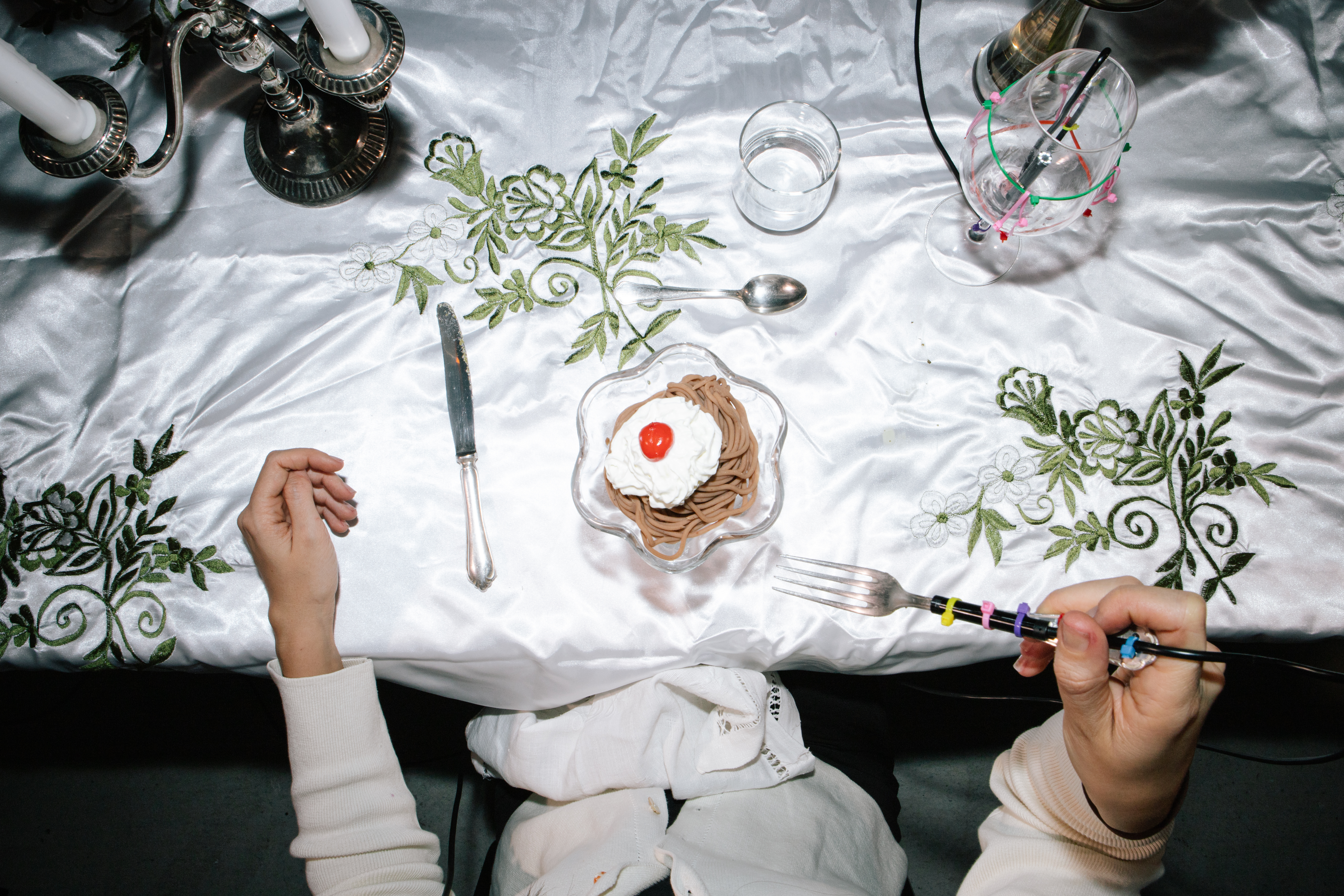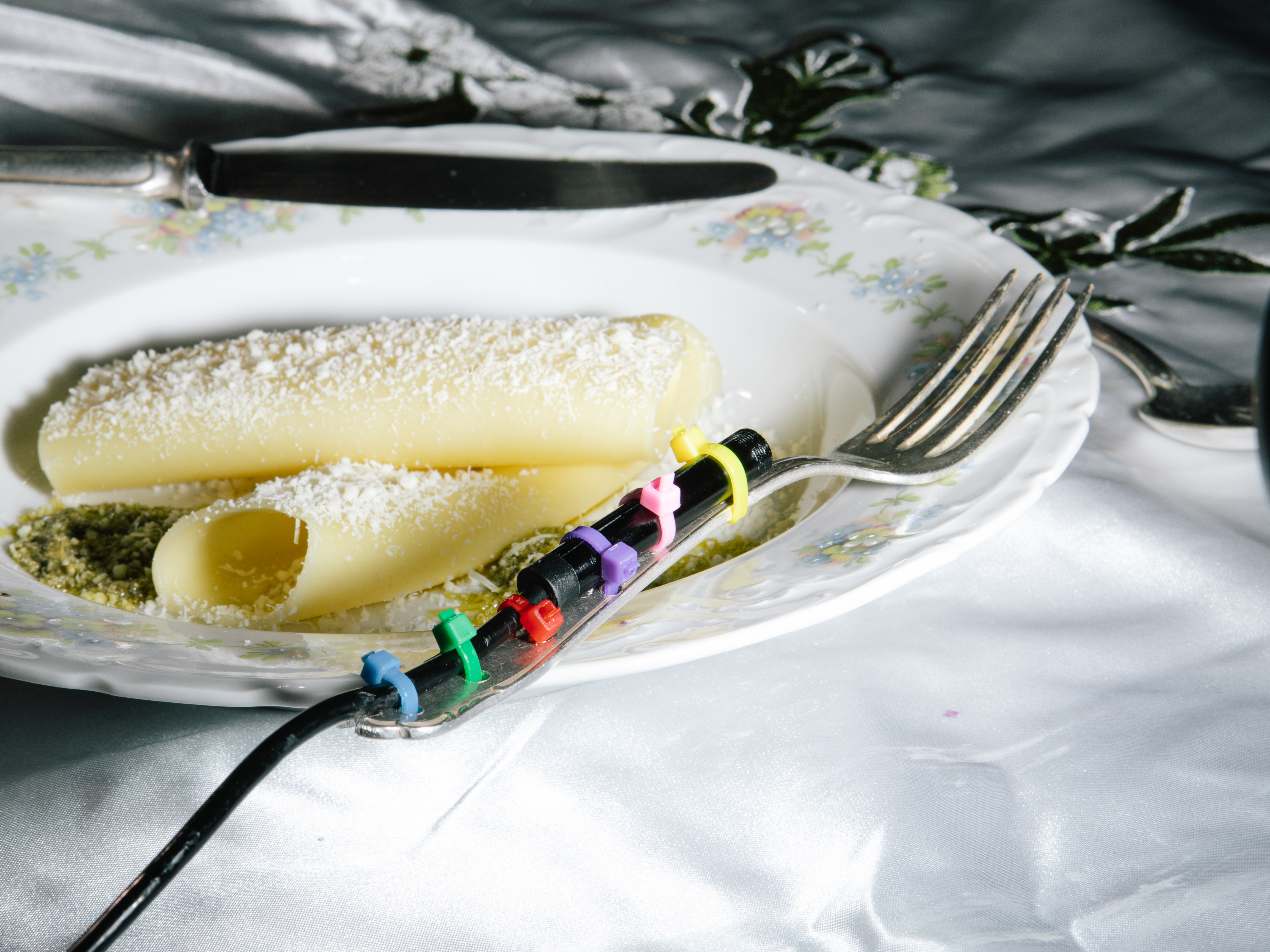 Das Ergebnis ist eine immersive Videoinstallation mit einer VR-Komponente, die den Moment des Essens aus einer ungewöhnlichen Perspektive erfahrbar macht. Der Fokus liegt auf der visuell inszenierten Reise des Essens von der Gabel bis zum Mund. Ergänzt wird das Erlebnis durch ein eigens entwickeltes Menü mit betont sensorischen Speisen – etwa Rotwein, mit dem Lasercutter bearbeiteten Cannelloni oder farbintensivem Randen in ungewöhnlichen Formen. Die dokumentarische Inszenierung arbeitet mit Nahaufnahmen, Soundscapes und gezielter Lichtregie. Der „ForkEye“ fungiert als symbolisches wie technisches Bindeglied zwischen Objekt und Wahrnehmung. Insgesamt zeigt das Projekt einen spekulativen, aber greifbaren Weg, wie Technologie und Design genutzt werden können, um alltägliche Vorgänge wie das Essen neu zu rahmen. Die entstandene Arbeit vereint gestalterische Neugier, technisches Experiment und ästhetische Reflexion.